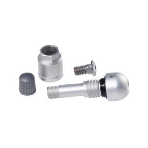 This service kit is for OE TPMS Sensors with replaceable aluminum valves. The typical kit consists of a new valve, grommet [seal], hex nut, valve core, screw, and dust cap.