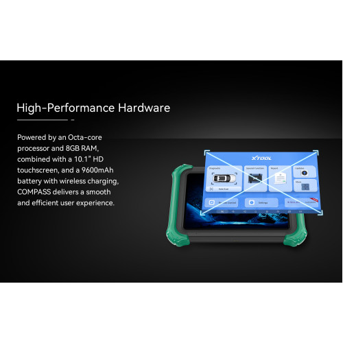 COMPASS is your ultimate diagnostic companion, designed for efficiency and precision. Featuring a crystal-clear 10.1" display and powerful performance, it ensures seamless operation for professionals.), it enables OEM software connectivity for advanced diagnostics and programming. Covering a wide range of vehicles, it offers topology mapping, ADAS calibration, and online coding. Plus, with wireless charging and long battery life, you can work without limits. COMPASS — smart, powerful, and built for the future of automotive diagnostics! ***For J2534 support please order the Compass Master. ****For 1 year of Identifix Direct Hit Professional software for $1,500 please order direct from XTool